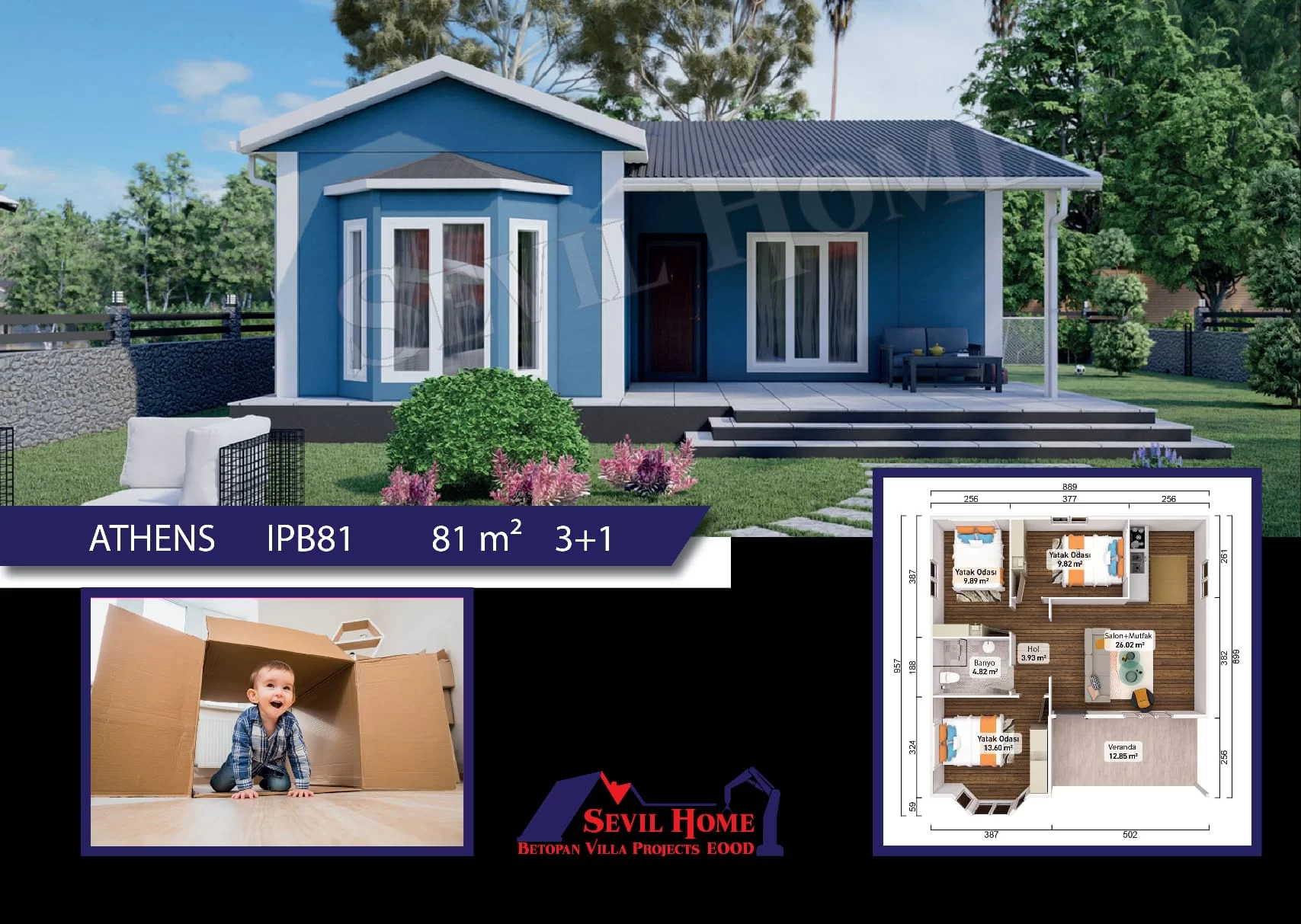 ATHENS Prefabrik Projemiz 81 m² Kare Olup Toplam Fiyati: 23.490 €'dur,